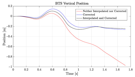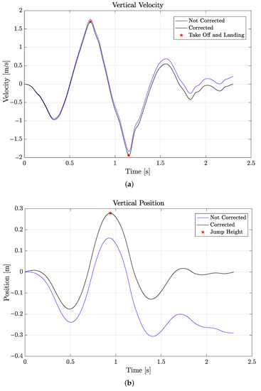 where and can be calculated from the application of initial and final conditions ( and ), as further discussed in Section 4.3. The corrected velocity can thus be integrated over time to yield the vertical displacement h that is needed in Equation (2).