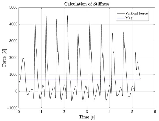 Figure 12 shows the vertical force, as obtained by the measured vertical acceleration, compared to the patient’s weight (horizontal line). The crossing points correspond to the time instants where the vertical force becomes larger or smaller than the weight of the patient [24], and from the abscissas of these points, we can easily measure the period T, then the corresponding angular frequency w, hence the stiffness parameter k in (6).