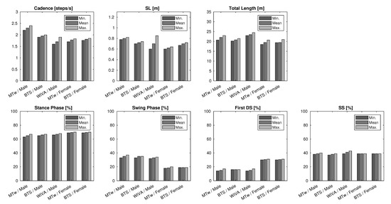 Figure 13 reports measurement results for the gait phases, obtained from the vertical acceleration of the lower back. The minimum, maximum, and average values, reported in the figure for some of the measured quantities, showed a good repeatability and accuracy of the measurements. Such an accuracy is further witnessed by the data shown in Figure 7, in the case of the BTS sensor, since the data plot can be used to discriminate between all the gait phases very accurately. A similar precision was obtained in almost every measurement performed with each sensor, as confirmed by the results in Figure 13. Indeed, each sensor returned reliable and repeatable data for the gait phases, with slightly less accurate measurements for the WIVA sensor, although still acceptable.