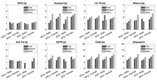 Figure 14 reports the measured values of the various time phases of the TUG Test, described in Section 3.2 (all values are in seconds). As was expected, for almost all time phases, the measured values increased from the fast to the slow mode of repetition of the test. Data recorded from the stopwatch (last graph) were very similar to that obtained from the sensors. For the BTS sensor, we marked with a null value (i.e., the bar is absent) those phase times that were absent or whose measurements showed an unrealistic value. These markers highlight those situations where the same data processing algorithms, described in Section 4, that worked for the MTw data did not manage to identify all the TUG phases correctly, when applied to data provided by the BTS sensor. Therefore, for the TUG Test, although BTS often gave convincing results, the reliability of the data provided by the MTw sensor proved to be superior.