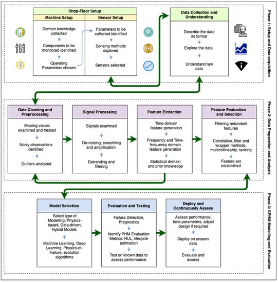Current approaches to PHM are tailor-made to individual systems and components on the shopfloor. Predictive maintenance methodologies, although applicable to heterogeneous machinery, are generic in their approach, without specifying the particulars of data acquisition, modeling and applications. SPHM is a concept that addresses the many facets of PHM in Smart Manufacturing in an interoperable manner. SPHM’s uniqueness lies in its interoperable framework, that addresses all the specifics of PHM by using Industry 4.0 and SM standards in a phased approach. The structure of the framework is loosely based on The Cross-Industry Standard Process for Data Mining (CRISP-DM) [], an industry standard to apply DM and ML keeping business objectives in mind. The framework consists of three interconnected phases, each with the objective of addressing some of the challenges discussed previously. The proposed SPHM framework for SM with all its phases is shown in Figure 2. The setup and acquisition of data from the shopfloor are covered in the first phase, the preparation of the data and an analysis of the various parameters collected in the data, including an understanding of signal processing, are enumerated in the second phase, and the modeling approaches to SPHM along with their evaluation are discussed in the third phase.