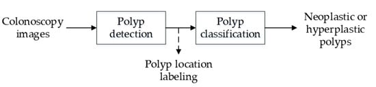 Figure 6 presents the architecture for the colorectal polyp detection and diagnosis system. The system is capable of polyp detection and classification. During colorectal polyp detection, the input colonoscopy images were preprocessed. The images in the data set were converted to grayscale images during preprocessing and applied for feature extraction and training to detect the location of polyps. The detected polyps were subsequently classified into neoplastic polyps (including adenomas and deep submucosal invasive cancer) and hyperplastic polyps.