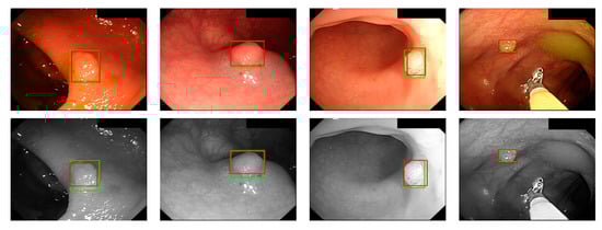 Currently, many medical images are processed into grayscale images, such as ultrasound, computed tomography (CT), and magnetic resonance (MR) images. Tan et al. [44] applied a gray-level cooccurrence matrix and CNN to CT images for polyp diagnosis. Zhang et al. [45] compress the three-channel color images of chest CT to grayscale images. A five-layer deep CNN with stochastic pooling is used to diagnose chest-based COVID-19. Xie et al. [46] mentioned that in deep learning, colors are not the key features influencing accurate image classification. They also discovered that in X-ray image classification, the speed and accuracy of processing grayscale images were considerably higher than those of processing RGB images. The grayscale method used was ITU-R Recommendation BT.601 [47]. Moreover, misjudgments were easily made in the presence of excessive intestinal wall textures, when polyps were too small (Figure 2), and when polyp textures were similar (Figure 3) to intestinal wall textures.