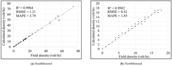 - Mean absolute percentage error (MAPE), shown in Equation (7), was used to assess density variation in different scenarios. Equation (7) has three terms: TTD is true traffic density, which is the field-measured density, CTD is calculated traffic density after applying a percent of error to volume and speed readings, n is the number of 15-min intervals used in the calculation, and i is any 15-min interval.