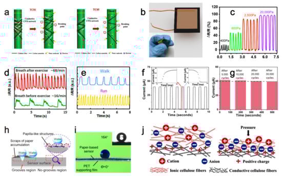The aforementioned paper-based sensors were mainly developed based on pressure-sensitive resistance, capacitance, and triboelectric current signals. They had concerns like complicated preparation methods, low responding speeds, and narrow linear response ranges. In addition, the most currently reported paper-based sensors failed to make full use of the paper’s printable, cuttable, and foldable properties. Researchers proposed the ion sensor paper (ISP) sensor platform based on the flexible ion sensor mechanism [23]. In this platform, an increment of the contact area among the ionic and conductive cellulose fibers was permitted once loading an external pressure that would cause a capacitance rise of the ISP sensor (Figure 2j). Based on the pressure-dependent capacitance change, the external pressure was measured. The sensor could be structured in the form of a two-dimensional plane or three-dimensional origami by specific operations of the ISP (such as printing, cutting, folding, or gluing), indicating its direct printability, custom cutability, and three-dimensional foldability. In addition, the sensitivity of the ISP device reached 10 nF/kPa/cm2, which was several thousand times of the capacitive–current paper sensors. Moreover, it had a fast mechanical response time of one millisecond and high response linearity with a resolution of 6.25 Pa. This work showed the proof of concept of a flexible and intelligent electronic sensing paper which had a significant sensing advantage and application potential in human-machine interface, smart packaging, and wearable healthcare products.