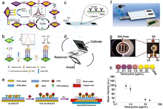 Unlike the strategies that performed substrate sensing based on enzyme or inorganic materials, Abigail’s group developed a novel paper-based biosensor utilizing yeast to detect doxycycline antibiotics [16]. This bio-based paper analysis device was sensitive to detecting doxycycline in a wide concentration range (30–10,000 μg/mL), for which, in the absence of doxycycline, the expression of the reporter by gene-edited yeast was blocked. In contrast, the interaction of doxycycline with the activator would result in the biased binding of the activator to the Tet operators of the yeast to allow transcription of the reporter when in the presence of doxycycline. Though there was a good linear relationship between doxycycline (10–100 μg/mL) and the reporter, doxycycline-induced yeast death under high concentrations is also a concerning issue. The most significant merit of this live cell-based sensor was that it could maintain activity even after more than one year of storage at −20 °C. This challenged the common sense of the short shelf time for bio-based sensors and expanded the space of long-term preservation and the use of biological products. For another bio-based sensor, Duyen’s team detected antibiotics via suppression of the bacterial gene expression [57]. In which the bacteria were immobilized on the paper discs containing a colorimetric substrate, and then, the paper discs were freeze-dried to construct the sensing paper. In the absence of antibiotics, the bacteria expressed β-galactosidase. β-galactosidase hydrolyzed the colorimetric substrate to present a color change of the paper from yellow to purple. Conversely, in the presence of antibiotics, the color change was hampered due to the inhibition of β-galactosidase synthesis. Researchers proved that barrotomycin, tetracycline (Figure 3h), chloramphenicol, and erythromycin could inhibit β-galactosidase expression of the bacteria. The detection limits to the four antibiotics were 0.5, 2.1, 0.8, and 6.1 µg/mL, which was enough to detect the antibiotic content in contaminated water (20 µg/mL of oxytetracycline in the detected water sample).