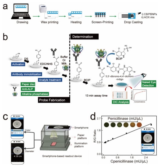 - Xu, J.; Chen, X.; Khan, H.; Yang, L. A dual-readout paper-based sensor for onsite detection of penicillinase with a smartphone. Sens. Actuators B Chem. 2021, 335, 129707. [Google Scholar] [CrossRef]