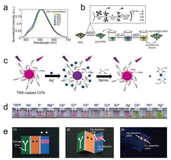Carbon dioxide (CO2) plays a vital role in climate change, plant growth, and agricultural pest control. The detection of CO2 is an essential prerequisite for humans to reasonably adapt to the evolution of nature and a requirement to protect the environment. Wang and coworkers designed a paper-based sensor for CO2 detection with high accuracy based on the fluorescence assay, in which the fluorescence peak position shifted after the absorption of CO2 with a detection limit of 5.7 ppm [33].