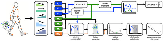 We investigated the use of a machine learning model to determine how well data from the pylon load cell alone could discriminate among different locomotion modes, with the goal of using the locomotion mode in an eventual control algorithm. For the model, we used nine sensor inputs (, , , , , , ,,). Prior to building the model, all inputs were resampled to 100 Hz to compensate for the non-uniform data collection frequency of the load cell. We performed feature extraction once per gait cycle from a data window preceding toe-off, with toe-off detected by the sagittal force falling below 8% body weight. We ended the window at toe-off because it is easily detectable using a prosthesis load cell and includes information from the stance phase prior to making a decision on how to control stiffness in the swing phase. For each sensor input, we extracted a feature set consisting of the mean, standard deviation, minimum value, maximum value, starting value, and ending value within the data window [25,32,33]. We separated feature sets by stiffness settings of the VSF (low, medium, high), as stiffness would be known in the case of real-time control. We used linear discriminant analysis (LDA) to create subject- and stiffness-dependent models. We used 10-fold validation to accommodate the small data set. For the model, we performed forward feature selection using a 30 ms window of data prior to toe-off. The chosen feature set included the features that resulted in the minimum classification error during the forward feature selection process. Next, we optimized the window size of the reduced-feature model, testing 100–500 ms windows in 33 ms increments. The model was then finalized using the feature set determined from forward feature selection and window size optimization processes. This process can be viewed in Figure 1.