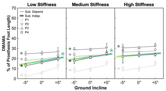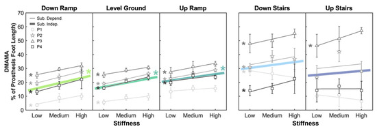 Linear trends showing the effect of prosthesis forefoot stiffness on DMAMA. Colored lines show the subject-independent data fit as a result of the linear mixed-effects model. Gray markers and vertical bars show each participant’s average and standard deviation values, respectively. Gray lines show subject-dependent linear fits. The asterisk (*) indicates a linear trend with a significant p-value (p < 0.05).
