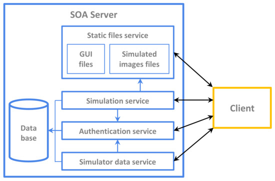 The system has been designed following a client-server architecture; the server, follows a service-oriented architecture (SOA), where services are depicted in Figure 1. The simulation service (Figure 1) uses the simple object access protocol (SOAP) given the need to exchange rich requests and responses with the client. The remaining services apply a representational state transfer (REST) application program interface (API).The server has been programmed in Python using the Django framework [23]. Simulations are performed using C++ and the ITK library; interaction with Python is achieved through a wrapper.