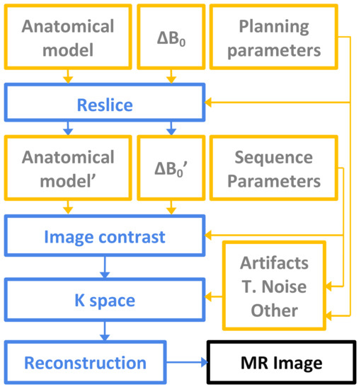 A diagram depicting the pipeline of the processing steps required for the computation of the simulated MRI images is shown in Figure 3. The procedure is as follows: