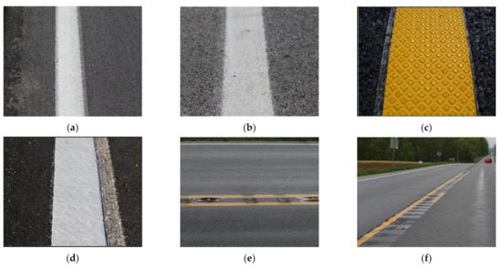 Unique pavement markings: (a) multi-component; (b) paint; (c) preformed tape; (d) thermoplastic; (e) dry rumble strips; (f) wet rumble strips. Image Source: Zehr, S.; Hardin, B.; Lowther, H.; Plattner, D.; Wells, T.; Habib, A.; Bullock, D.M. Rumble Stripes and Pavement Marking Delineation; Purdue University: West Lafayette, IN, USA, 2019; doi:10.5703/1288284316937.