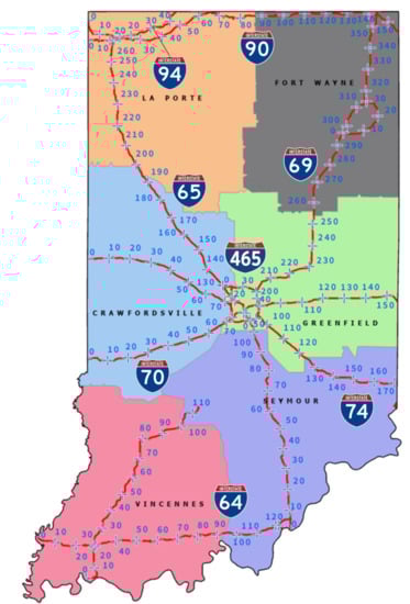 - Day, C.M.; McNamara, M.L.; Li, H.; Sakhare, R.S.; Desai, J.; Cox, E.D.; Horton, D.K.; Bullock, D.M. Indiana Department of Transportation. Purdue University 2015 Indiana Mobility Report and Performance Measure Dashboards; Purdue University: West Lafayette, IN, USA, 2016. [Google Scholar] [CrossRef]