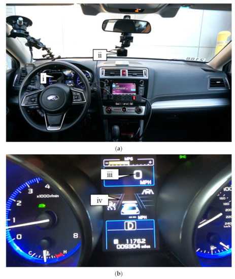 To demonstrate a proof-of-concept, data were collected with two GoPro Hero 8 cameras using a University Subaru fleet vehicle during summer 2020. Figure 5a shows the data collection setup with one camera focused on the instrument cluster (callout i) of the vehicle and the other capturing the roadway conditions (callout ii). Figure 5b shows an image from the camera collecting images of the instrument cluster. The speed of the vehicle can be seen in callout iii and the LKA status in callout iv. Images were taken at half-second intervals with timestamps and GPS location information. The roadway condition images were only used for data validation.
