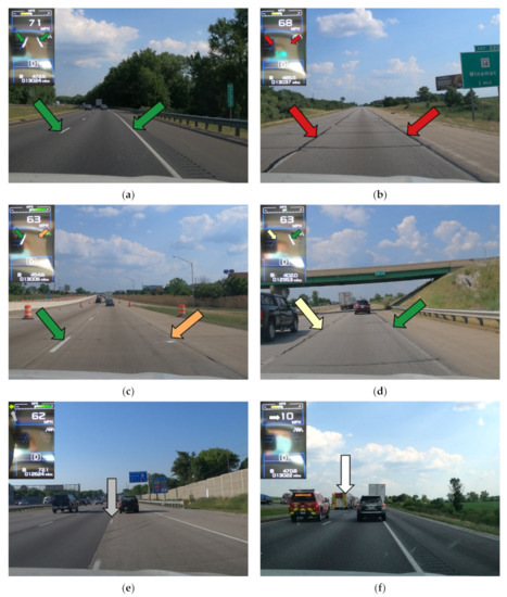 Figure 6. Categories of lane markings: (a) both detected; (b) both not detected; (c) right not detected; (d) left not detected; (e) excluded (lane change); (f) no data (speed less than 40 mph). - Both not detected: Both lane markings were not detected by the vehicle with no turn signal on, and the vehicle speed was greater than 40 miles per hour (mph) (Figure 6b);