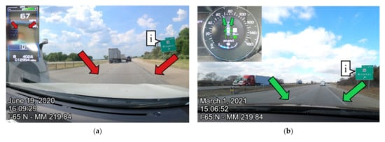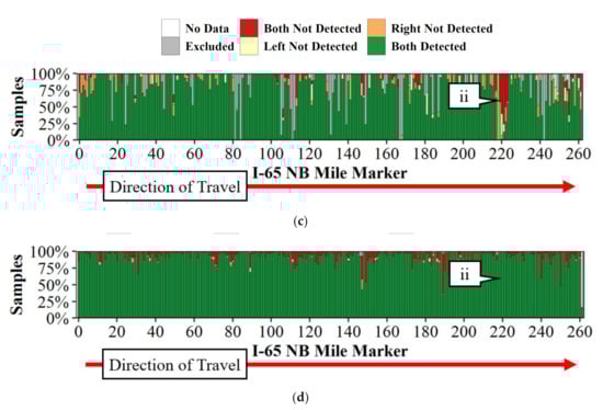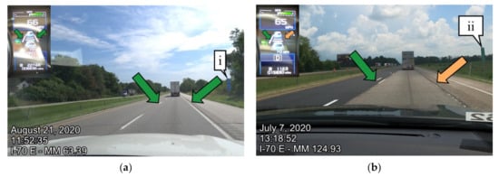 In specific locations, there were noticeable differences between the summer 2020 and winter 2021 data collections. Figure 7 shows an example of I-65 northbound from the summer 2020 data collection and winter 2021 data collection. Figure 7a shows the road view and instrument cluster in the northbound direction at mile marker 219.84. Figure 7b shows the same location eight months later when the pavement markings were repainted. Callout i is a reference sign that can be seen in both road view images. The categorizations from the instrument cluster images and the CAN interface were aggregated to the nearest tenth mile. The data were then aggregated to the nearest mile for legibility. Figure 7c shows the lane marking detection across all of I-65 northbound. The plot shows the data spatially by mile marker on the horizontal axis and the percentage of signals in each category on the vertical axis. Callout ii indicates the location where the images were taken in Figure 7a,b. During the summer of 2020, the pavement markings were not visible, while in the winter 2021 data collection, the pavement markings were repainted, making them visible to the driver as well as easily detectable by the vehicle.