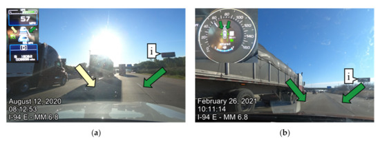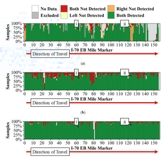 Noticeable performance differences in the detection of lane markings were observed on I-70 due to the fact of seasonal variations as shown in Figure 8. Figure 8a shows the quantitative lane detection performance across I-70 during the data collection run from summer 2020, whereas Figure 8b,c show similar performances on the same interstate during February and March, respectively, in winter 2021. Figure 9 shows example images of the road and instrument cluster for each of the data collections and at two unique points. Callout i in Figure 8 is the location of Figure 9 on I-70 eastbound at mile marker 63. During the February data collection (Figure 9c), the vehicle was unable to detect the pavement markings, which is indicated by the red both not detected arrows directing your attention to the instrument cluster and pavement markings. When comparing Figure 8a–c, it appears that Figure 8a July data show construction impact resulting in the poor lane marking detection, with limited impact due to the construction in February and March. Figure 8b has significantly more instances of both not detected that is likely due to the salt residue on the road surface. Further observation shows that salt residue on the pavement caused difficulty for the vehicle in detecting the pavement markings.