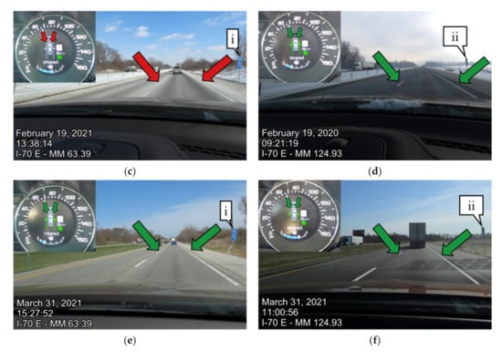 Case examples of lane marking detection with the camera image from the dash view and instrument cluster view on the same interstate I-70 eastbound are shown in Figure 9 for qualitative assessment. Callout i in Figure 8 can be seen qualitatively in Figure 9a for July 2020, Figure 9c for February 2021, and Figure 9e for March 2021. Callout i in Figure 9 references milepost 63.4, the same location as callout i in Figure 8. Similarly, lane marking detection can be seen qualitatively for callout ii in Figure 8 in Figure 9b for July 2020, Figure 9d for February 2021, and Figure 9f for the March 2021 collection. Callout ii in Figure 9 shows the vehicle approaching milepost 125.