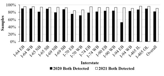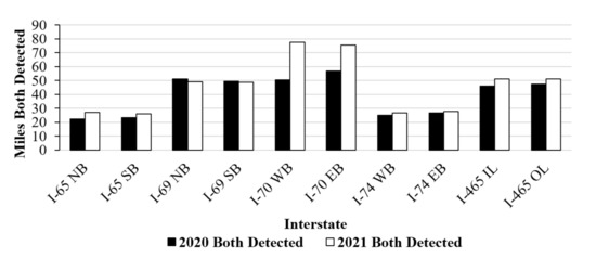 I-70 in both directions also had fewer detected pavement markings compared to other interstates due to the lower vehicle speeds during data collection in summer 2020. The lower speeds were caused by road construction, inclement weather, and crashes. Overall LKA collected during the winter 2021 season yielded an LKA detection of 90.7% across the state of Indiana compared to summer 2020 where only 81.9% of pavement markings were both detected. The combination of construction activities, inclement weather, crashes, traffic congestion, and variable lighting conditions caused many of the detectability differences and demonstrates the importance of crowdsourcing LKA data.