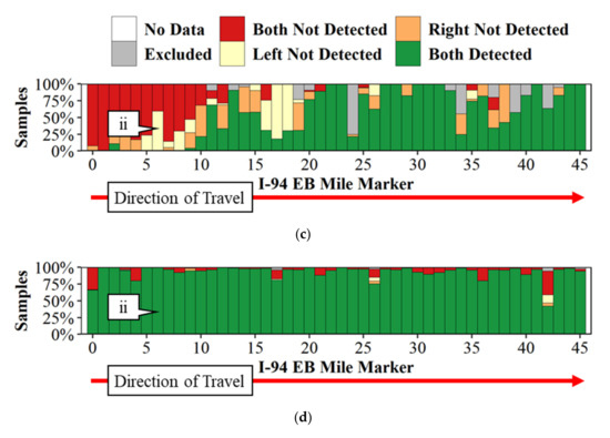 During the summer of 2020, only 52.3% of lane markings were detected by LKA on I-94 eastbound (EB). This was due to the poor lighting conditions at the time of data collection. For the winter 2021 data collection, 92.6% of lane markings were detected by LKA on I-94 EB. Case examples of lane marking detection with the camera image from the dash view and instrument cluster view on the same interstate, I-94 eastbound, are shown in Figure 11 for qualitative assessment. Figure 11a shows the August 2020 data collection and qualitatively shows the impact the sun reflection has on the visibility of lane markings. Figure 11b depicts the same location during the February 2021 data collection at a different time of day where the lane markings were detected by the vehicle. Callout i in Figure 11 shows a billboard landmark for reference. Figure 11c, d show lane marking detectability for all of I-94 eastbound. Observed in Figure 11c is that a larger proportion of lane markings were not detected on the right, left, and on both sides of the vehicle from miles 0–20. The road view images suggest that the poor detection is due to the sun reflection. Figure 11d shows the February 2021, lane marking detectability and the pavement markings were detected likely because there was less impact from the sun reflection. Callout ii in Figure 11 shows the image location of Figure 11a,b.