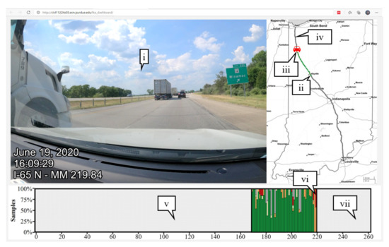 Figure 13 shows an example of how such an interactive user interface would look. The web application would connect to a cloud database system to retrieve dashboard imagery of opted-in drivers or fleet vehicles at a specific location (callout i), a map of the route travelled by a vehicle (callout ii), and the current location of a vehicle (callout iii). The database would also have knowledge of the total route to be travelled (callout iv). The route is also linearized by mile in the bottom graphic (callout v). As the vehicle collects data, the road conditions are categorized, and each bar would be populated according to the distribution of this and other vehicles (callout vi). Any locations that this vehicle or collection of vehicles have not yet travelled would be shown in grey (callout vii).