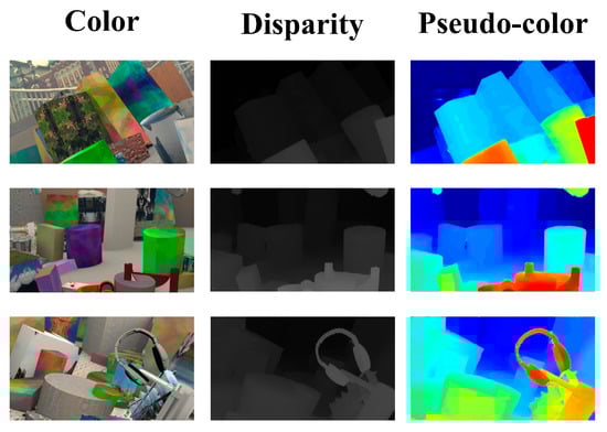 Visualization of disparity prediction results using our network on Scene Flow dataset. The first column is RGB images, the second column is disparity images estimated by our method, and the last column is the pseudo-color disparity images for showing them more clearly.