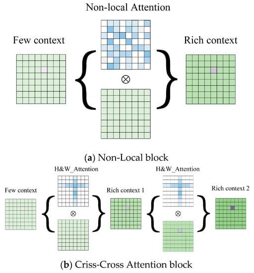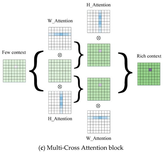 Diagram of three approaches to attentional context aggregation. The white and blue grids are different attention modules. The green grids are original feature images that changed through the attention modules. (a) A common non-local block with a global feature aggregation [36]. For each pixel, the aggregated result is obtained through intensive mapping with different weight allocations. (b) A Criss-cross Attention block [35]. The different weights are assigned in the horizontal and vertical directions serially. (c) A Multi-Cross Attention block that is different from (b). We adopted the structure in horizontal and vertical directions in parallel and separately to aggregate features more adequately. At the same time, we retained the residual connection to achieve a better feature aggregation effect.