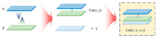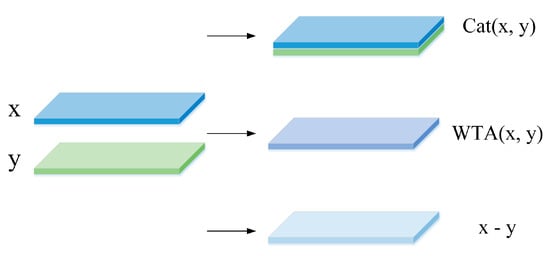 In the previous step, the feature images of the binocular image pairs can be obtained. Because they are low-resolution features after the sub-sampling, the time consumed in calculation is reduced. Next, we built the cost volume to fuse the left and the right feature images extracted from the twin network. As shown in Figure 5, some other networks use single feature combinations to connect the x, y characteristics. We can find the context information fully, where x and y represent the features extracted from the left and right images. Three build methods are shown from top to bottom in Figure 5. The first one is to connect x and y directly according to the channel to get the simple fusion of the two eigenvectors. This method is simple to implement and lacks less information. The second is to use the winner-takes-all idea. The minimum disparity of Euclidean distance between two eigenvectors is selected. To a certain extent, this approach can be close to the optimal result, but the fault tolerance is very low, and some original information will be lost. The last option uses the uniqueness of the stereo matching network and only finds the disparity deviation in an image just along the polar. Therefore, we obtain more accurate disparity information by constructing the cost volume using x − y from the left and right feature images after learning the weights by sharing the twin networks.