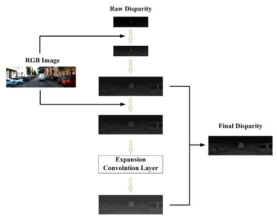 Our edge-guided refinement network. The RGB image is used to guide the 2D convolution process of the raw disparity image with two layers, and the expansion convolution is used to enhance the fusion effect. In this way, the fine disparity image is obtained in the end.