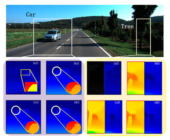 The rendering of the multi-level cost volume ablation experiment on KITTI2015. (a1,a2) are the ground truth, (b1,b2) are the result of the prediction of cost volume constructed in 32 dimensions, and (c1,c2) are in 96 dimensions, (d1,d2) are in 128 dimensions. As you can see, for the car in the left box, the shape in (b1,d1) is not fitting, and the car in (c1) is the similar shape. For the trunk in the right box, there are still unclear edges and target truncations in (b2,d2), the shape that best fits the true depth image in (c2).