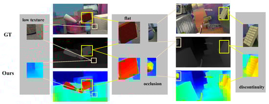 Figure 10 shows that our network works well for a wide variety of regions. There is little similarity between the pixels in low texture regions, but we can still estimate the image effectively. We can achieve flat surfaces without spots in flat regions and estimate the approximate contour in occluded regions. For the discontinuous region, we can estimate the texture of the object clearly.