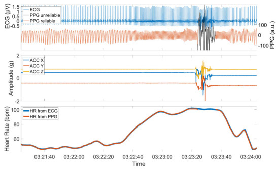 PPG and ECG signal (upper panel), the simultaneously recorded ACC signal (middle panel), and the derived PPG and ECG heart rate (lower panel). The PPG signal is composed of sections with high quality when the patient is at rest and sections of low quality when the patient is active. The PPG signal was automatically assessed using time-resolved spectral entropy to identify intervals containing artifacts.