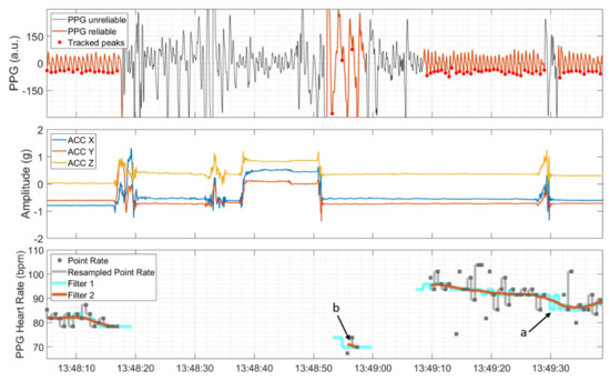 PPG signal, automatically divided into sections of reliable and unreliable quality and detected peaks (upper panel), and ACC signal showing movements at the same time (middle panel). The PPG heart rate and the associated intermediate steps; that is, resampling of the point rate, moving median (Filter 1), and moving mean (Filter 2), are depicted in the lower panel. Short duration gaps are interpolated by Filter 1 (marked by ‘a’), and isolated short PPG HR segments are removed by a postprocessing step (marked by ‘b’).