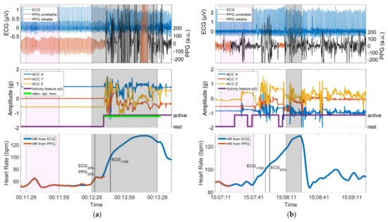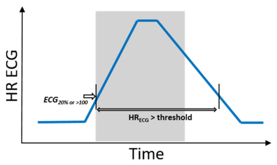 The second threshold was defined as the first time point following the baseline interval at which the HR exceeded 100 bpm, which are hereinafter also referred to as PPG>100 and ECG>100 for the PPG and ECG signal, respectively.