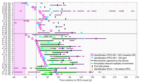 Seizures rated as hits ordered by timing of identification of IT relative to EEG onset, based on the earlier of the two PPG-based threshold crossings, and divided into non-motor seizures, seizures with non-relevant epileptic movements, and seizures with relevant epileptic movements (in this order and separated by the dashed horizontal lines). The timing of identification of the earlier of the two ECG-based threshold crossings is plotted for those cases in which identification based on PPG occurred at least 10 s later.