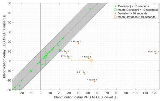 Time of identification of ECG- vs. PPG-based threshold crossings relative to EEG onset, for those seizures for which IT was found by at least one threshold crossing. The identification time refers to the earlier of the two (i.e., either HR > 20% baseline HR or HR > 100 bpm). The dashed crosses at the mean points indicate the 25th to 75th percentile.