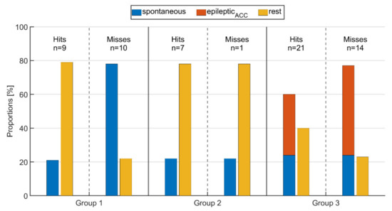 Proportion of spontaneous movements, epileptic movements (epilepticACC), and resting phases during time intervals of (ictal or peri-ictal) tachycardia for seizures rated as either hit or miss for the respective groups.