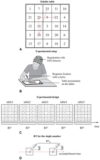 To address this issue, we subjected children and adults to the Schulte table (ST) with the simultaneous recording of their brain electrical signals with EEG sensors and response time. Performing this task relies on several cognitive processes, including visual search, working memory, and mental arithmetic, so the ST is appropriate for the stated goals. Monitoring cortical activity during cognitive task completion with an EEG system allows obtaining objective information about the brain’s functioning and the occurring cognitive processes with a reasonable spatial and good time resolution [,,]. At the same time, electroencephalography is an easy-to-use and safe non-invasive technology that is especially important when working with children.