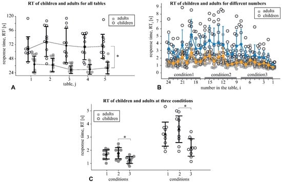 Then, we compared the response times, (Figure 2A), taken to accomplish the j-th Schulte table between the age groups, children vs. adults, via the mixed-design ANOVA with the table as the within-subject factor. We found a significant effect of age: evidenced that the adults took less time (M s, SD ) to accomplish the table than the children (M s, SD ). We also observed the insignificant effect of the table: and an insignificant interaction effect, as the age group × RT: . The obtained results manifested that the adults performed all tables faster than children.