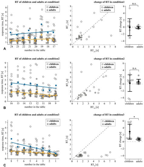 We analyzed how the RT changed within the conditions by contrasting it at the beginning and the end of each condition. In the condition1 (Figure 3A), the effect of the time-moment (begin vs. end) was insignificant: . The interaction effect, time-moment × age group was also insignificant: . For the condition2 (Figure 3B), the effect of the time moment was insignificant: , , as well as the interaction effect: . For condition3 (Figure 3C), we found a significant effect of the time moment: , and a significant interaction effect: . The post hoc analysis with the paired samples t-test revealed that children decreased their RT from 3.89 s (SD ) to 1.02 s (SD ): . The adults’ RT decreased from 1.47 s (SD ) to 0.76 s (SD ): . The analysis of the pairwise differences showed that all subjects followed the group tendency in both age groups. Finally, the Mann–Whitney U-test revealed that children demonstrated greater RT change (M s, SD ) than the adults (M s, SD ): (Figure 3C).