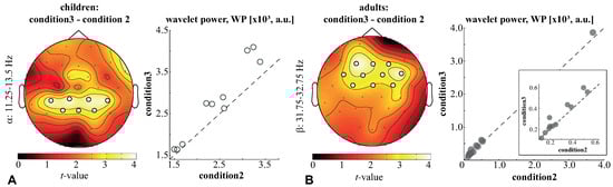 First, we compared the wavelet power (WP) of children and adults between the three conditions. For both the children and adults, no differences were found between condition1 and condition2. On the contrary, when contrasting children’s WP in condition3 and condition2, we found a significant positive cluster with in the frequency band of 11.25–13.5 Hz. For this frequency band, we averaged the WP and contrasted it between the conditions. As a result, we observed a significant cluster with , including EEG sensors in the parietal (P3, P4, Pz) and parieto-central (CP5, CP1, CP2, CP6) regions. The analysis of the pairwise differences revealed that the WP in this cluster was higher under condition 3 in all children (Figure 4A). Regarding the adults, a significant positive cluster with was observed in the frequency band of 31.75–32.75 Hz. Testing the averaged WP in this band, we observed a significant cluster , including EEG sensors in the frontal (F3, F4, Fz), central (C3, C4, Cz) and fronto-central (FC5, FC1, FC2, FC6) areas. An analysis of the pairwise differences revealed that the WP in this cluster was higher under condition3 in 10/12 adults (Figure 4B). These results evidenced that neither children nor adults exhibited changes in the WP between condition1 and condition2. Thus, for the further analysis, we averaged WP across these conditions.