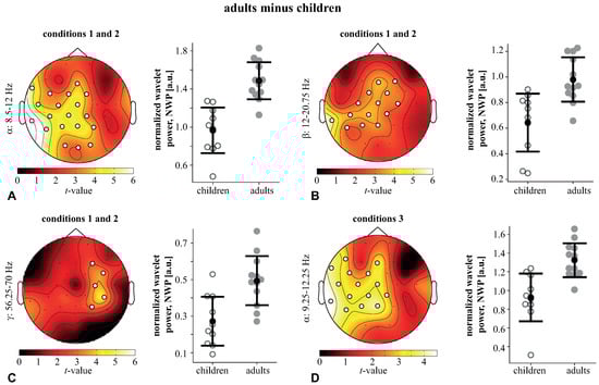 The WP of adults was contrasted to that of children under conditions1,2 and condition3. The children demonstrated a higher WP across all frequencies and conditions due to the higher amplitude of EEG signals. Thus, we compared the normalized wavelet power (NWP) in children and adults (see methods). Under conditions1,2, we found two positive clusters with and in the frequency ranges of 8.5–20.75 Hz and 56.25–70 Hz. Based on the obtained results, we defined the frequency bands of interest as : 8.25–12 Hz, : 12–21.5 Hz, and : 56.25–70 Hz. The mean NWP in these bands was compared between the adults and children. In the -band, a significant cluster () included occipital (O1,O2, Oz), left-lateralized parietal (P7, P3, P4, Pz), sensorimotor (CP5, CP1, CP2, C3, Cz, FC5, FC1, FC2), as well as left temporal (TP9, T7, FT9), and frontal midline (Fz) EEG sensors. The NWP of this -cluster in adults (M , SD ) was higher than in children (M , SD ) (Figure 5A). In the -band, a significant cluster () included the left-lateralized parietal (P7, P3, Pz) and parieto-central (CP5, CP1, Cp2) sensors, as well as the bilateral central (C3, C4, Cz) and fronto-central (FC1, FC2) sensors, left temporal (TP9) and right-lateralized frontal (F4, Fz) sensors. The NWP of this -cluster in adults (M , SD ) was higher than in children (M , SD ) (Figure 5B). In the -band, a significant cluster () included EEG sensors in the right-lateralized sensorimotor (P4, CP6, C4, FC6) and frontal (F4) areas. The NWP of this -cluster in adults (M , SD ) was higher than in children (M , SD ) (Figure 5C). Under condition3, we only found one positive cluster with the frequency range of 9.25–12.25 Hz. Testing the averaged NWP in this band, we observed a significant cluster () including the left-lateralized parietal (P7, P3, Pz), sensorimotor (CP5, CP1, CP2, C3, Cz, FC5, FC1), the frontal (F7, Fz), and the left temporal (TP9, T7, FT9) EEG sensors. The NWP of this -cluster in adults (M , SD ) was higher than in children (M , SD ) (Figure 5D).