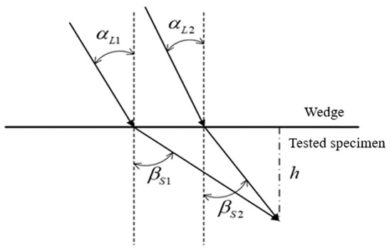 According to Snell’s law, the angle of the transverse wave propagates in the sample can be obtained, and the wave path of the signal is calculated to determine the time delay of incident signal for the generation of longitudinal wave. Figure 3 shows the propagation of the signals in the sample, where l1 is the distance traveled by the longitudinal wave in the wedge, l2 is the distance traveled by the refracted transverse wave in the specimen, and h is the distance traveled by the longitudinal wave in the sample. The propagation time can be calculated as shown in Table 1 according to the wave velocity corresponding to each propagation distance.