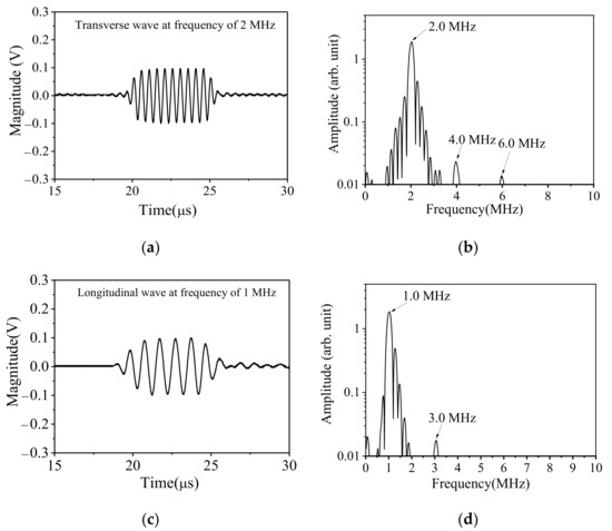 The time– and frequency–domain diagrams of the received signals of both incident waves are shown in Figure 5, where the central frequencies of the received signals are 2.0 MHz and 1.0 MHz, respectively. Furthermore, the time of signal receiving is very close to the theoretical value. Thus, we are convinced that these two signals are the desired waves.