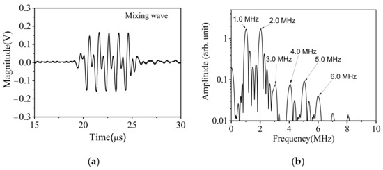 Figure 6a shows the time–domain response when the two bulk waves intersect and interact at the desired region. Compared with the 2.0 MHz and 1.0 MHz signal excited separately, a significant distortion occurs to the mixing signal’s waveform. However, it is still necessary to confirm the presence of a new frequency component by further performing a Fast Fourier Transform (FFT) on the received signal, and the result is shown in Figure 6b.
