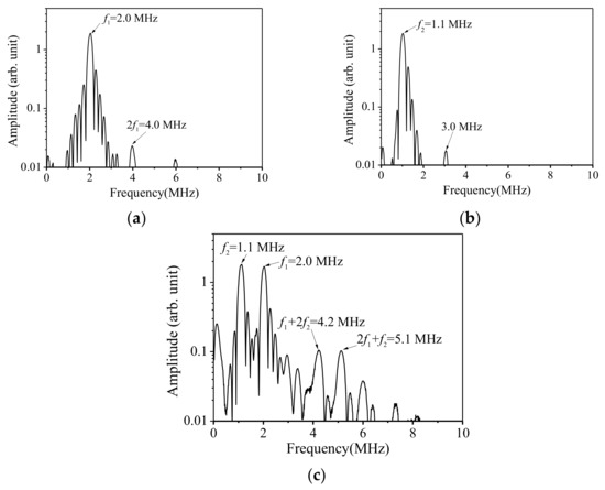 - When the two signals of 2 MHz and 1.1 MHz are excited simultaneously, there is no obvious sum–frequency signal (3.1 MHz) in the frequency domain.