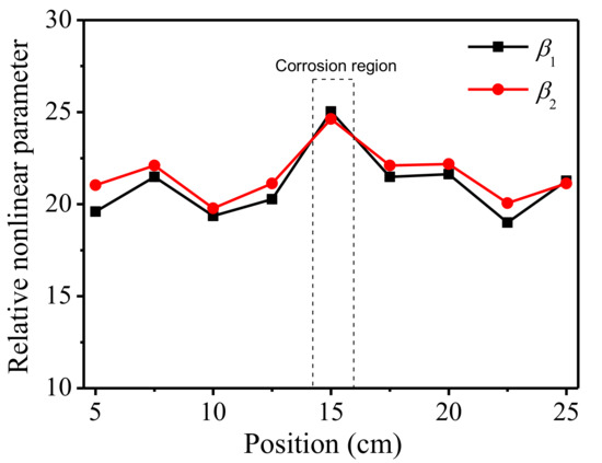 Variations of acoustic nonlinear response at different locations of the sample are used to identify the local damage. As shown in Figure 9 and Figure 10, it can be found that the sharp increase in nonlinear parameters at certain position of the specimen, can be used to identify and locate the damage. On the other hand, the nonlinear parameters are consistent and stable in the intact region of the specimen.