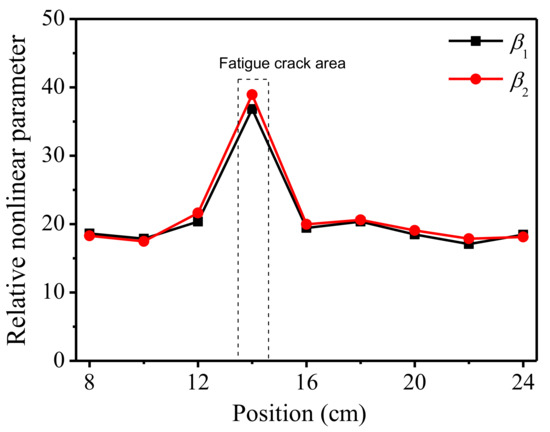 As the thickness of the fatigue sample is larger than that of the corrosion one, the wave path of the transverse wave in the sample is longer and, accordingly, the distance between the longitudinal wave probe and the wedge is greater. Therefore, when the sample is scanned horizontally, the range of movement of the probes is smaller than that of the corrosion sample. The scanning starts at a distance of 8 cm from the left edge of the specimen, measuring once every 2 cm until reach the distance of 4 cm from the right edge, a total of nine positions. The positions are located on the center axis of the specimen surface. The relative nonlinear parameters at different positions are shown in Figure 10.