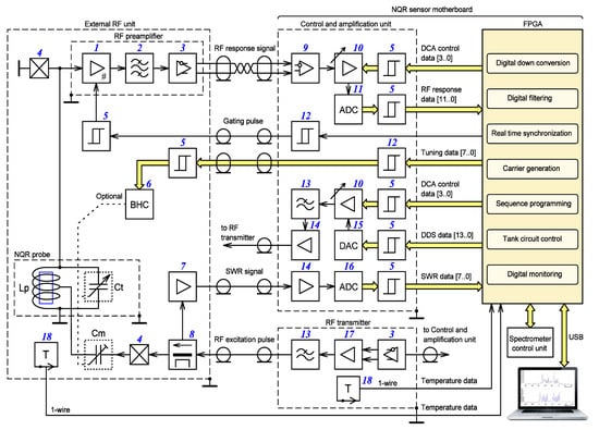 Block diagram of an NQR sensor: (1) gated amplifier; (2) bandpass filter; (3) differential driver; (4) diode limiter; (5) non-inverting buffer; (6) binary–hexadecimal converter; (7) driver amplifier; (8) reflection measurement circuit; (9) differential buffer; (10) digital controlled amplifier; (11) 12 bit analog to digital converter; (12) non-inverting driver; (13) low-pass filter; (14) buffer amplifier; (15) 14 bit digital to analog converter; (16) 8 bit analog to digital converter; (17) radio frequency power amplifier; (18) temperature sensor; (Cm) matching capacitor; (Ct) tuning capacitor; (Lp) probe coil.